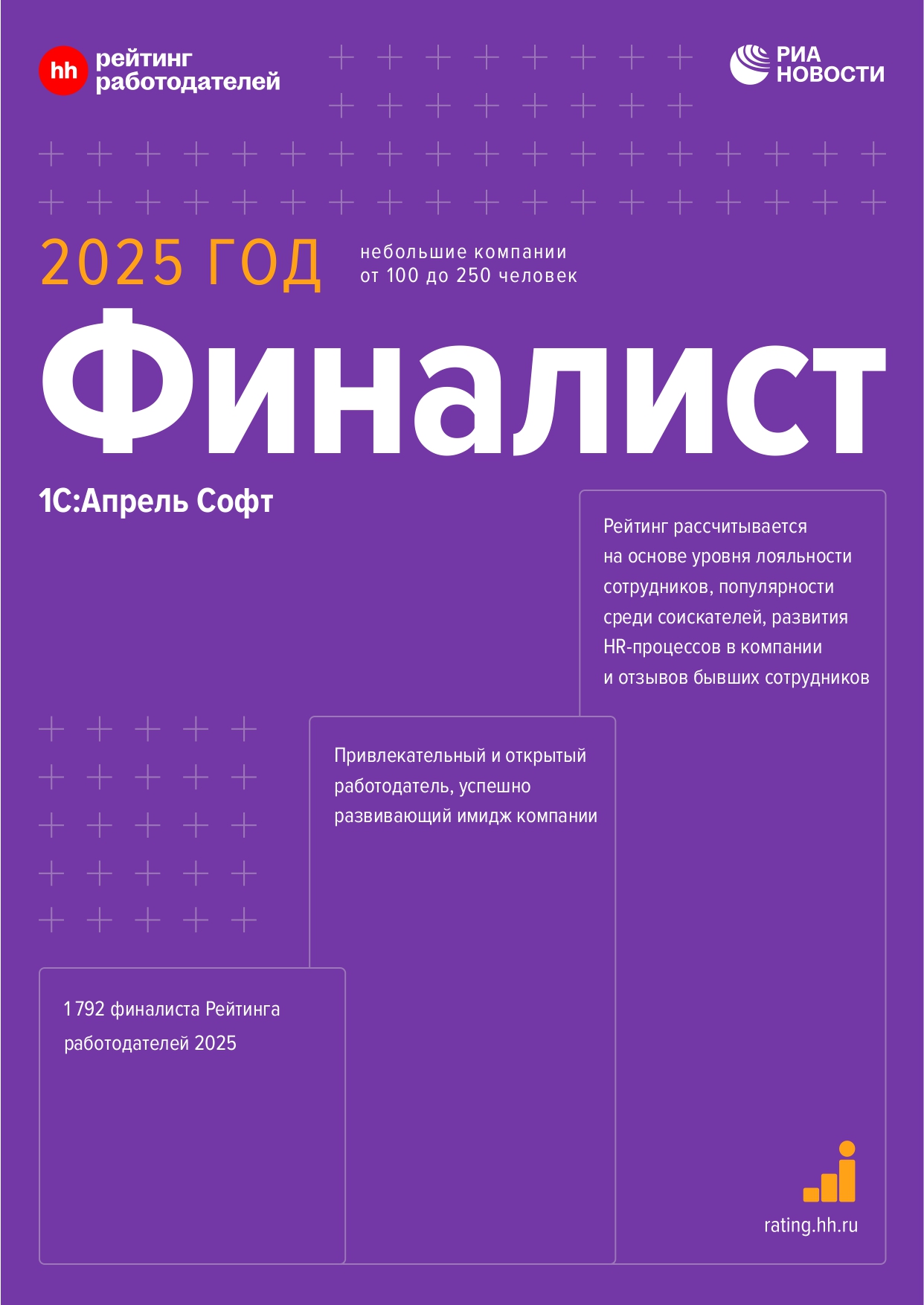 По итогам рейтинга работодателей 2025 года компания 1С:Апрель Софт вошла в топ-3 среди ИТ-компаний Нижегородской области в своей категории по версии hh.ru.